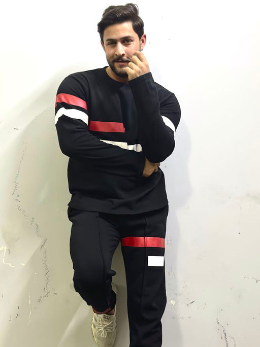 Men's Knitted Jacquard Full Sleeved Sweatshirt Cut & Sew Black-White-Red - SWTSJ0323