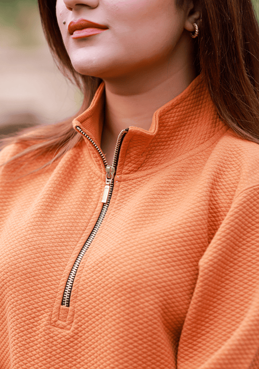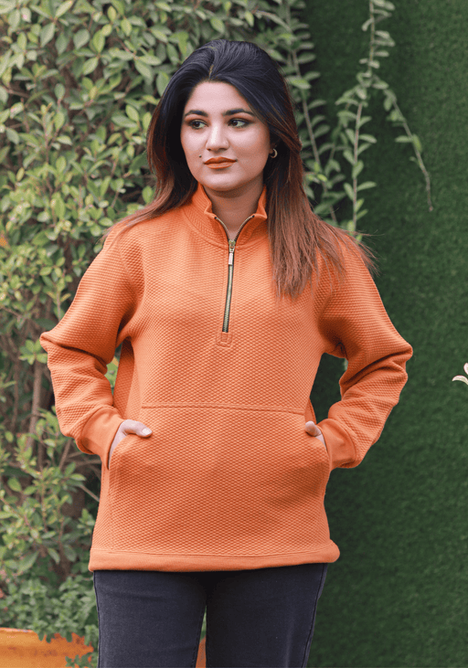 Introducing our Premium Jacquard Mock Neck Zipper With Pockets in a stunning Deep Coral shade, this sweatshirt is a must-have for every fashion-for...